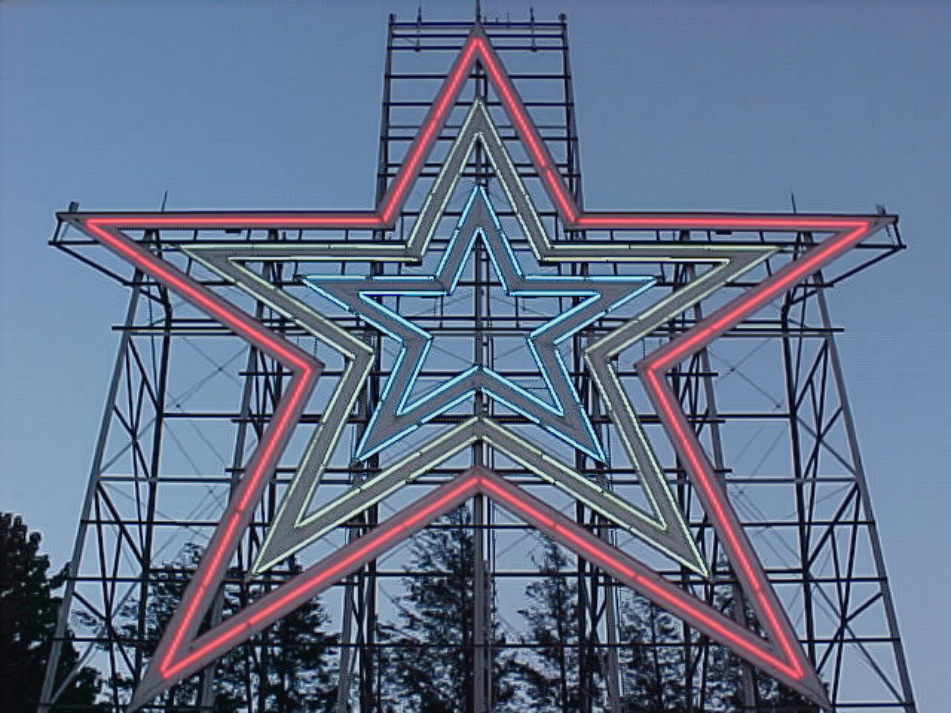 This image depicts the Roanoke Star on the evening of June 15, 2002. The original is on the left, and the control image, upscaled with Paint Shop Pro 7 to 1920×1440, is on the right. It was taken with the original Mavica, right after the star had lit up for the evening. It appears as the second photo in the sunset page of the Roanoke Star photo set.