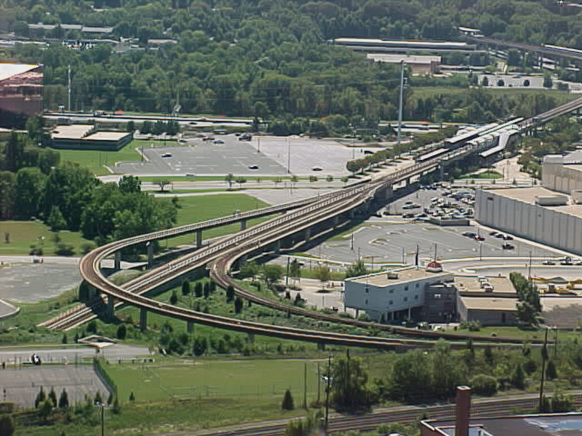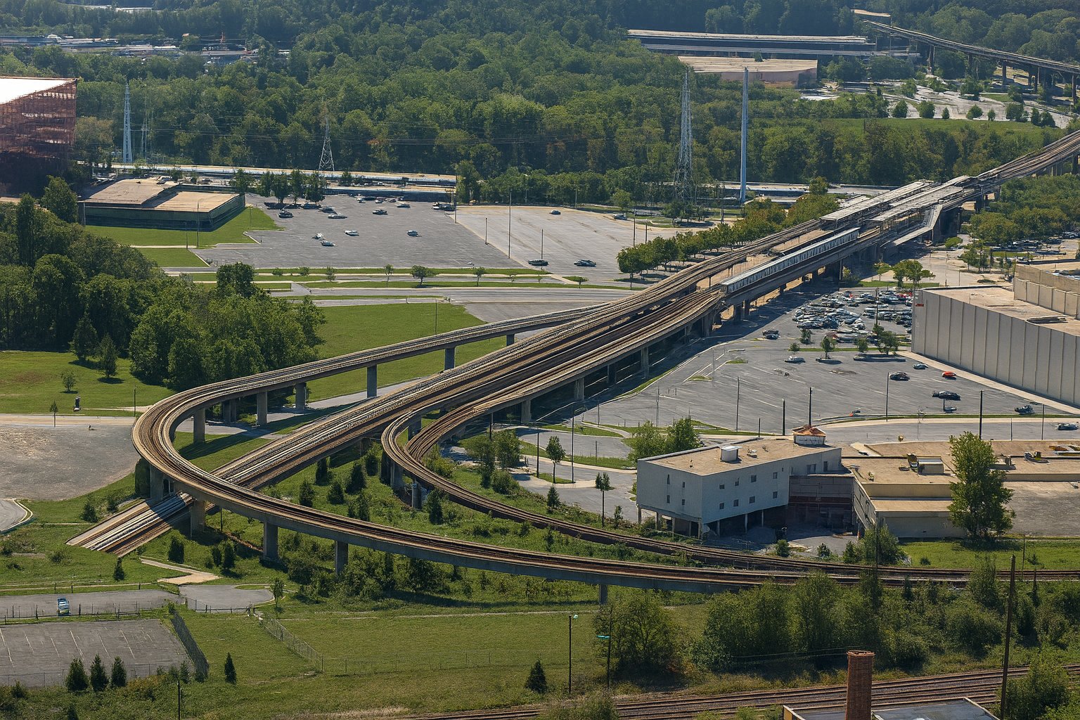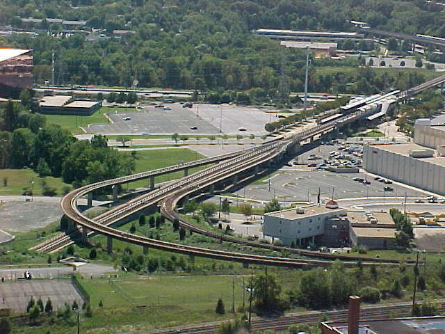 This photo was taken on September 28, 2002 from the top of the George Washington Masonic National Memorial, and shows the southern end of Metro’s Yellow Line, with Eisenhower Avenue station near the right of the shot, and Huntington station visible in the distance.