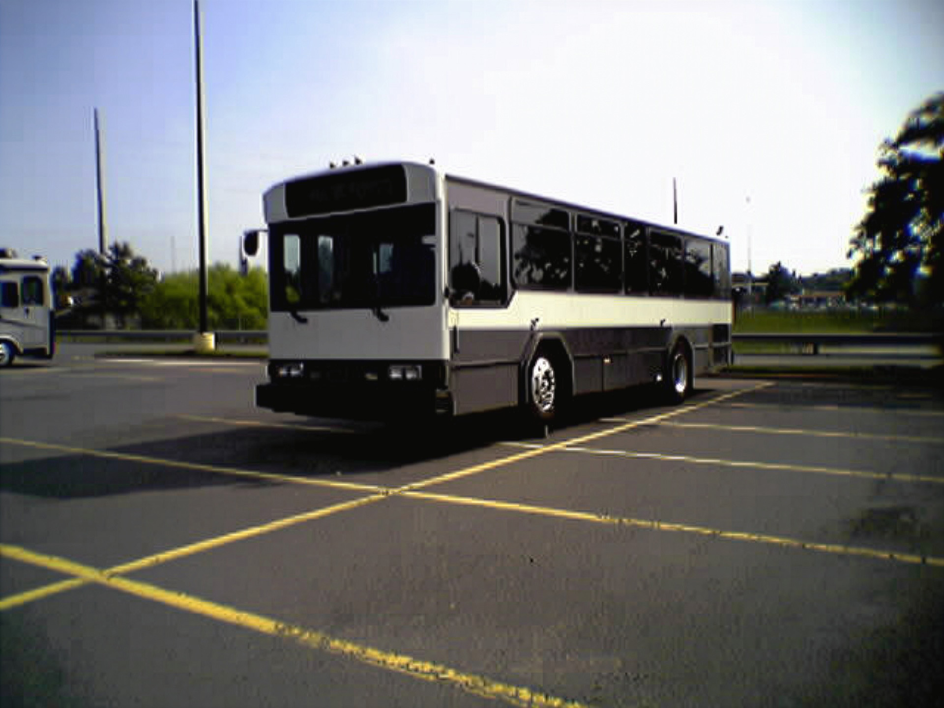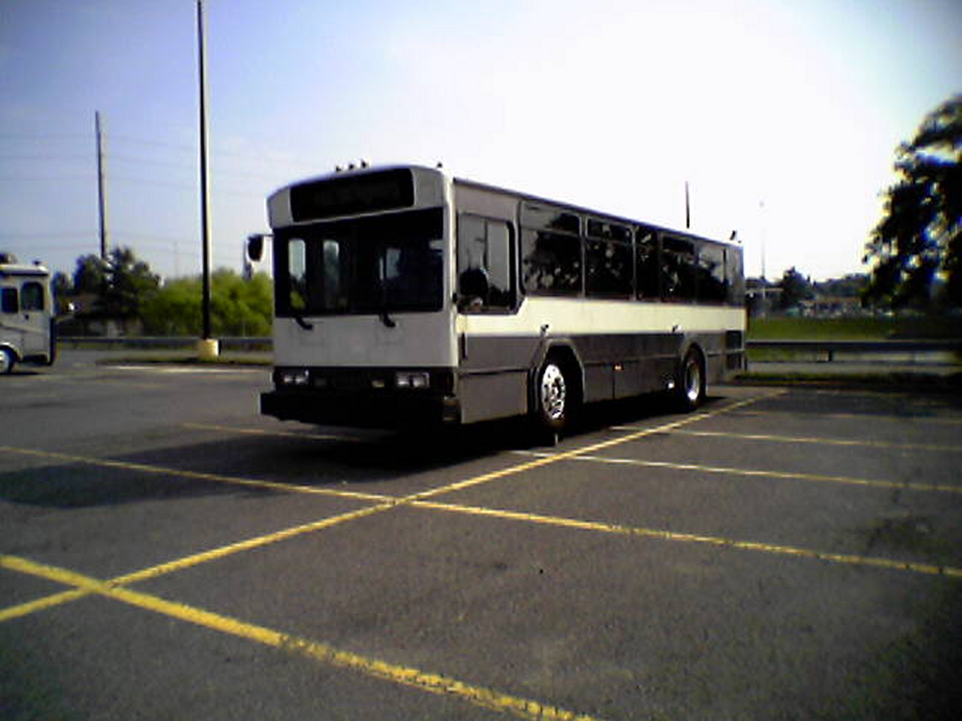 This shot depicts a Gillig Phantom in the back of the parking lot of the Walmart on Stream Walk Lane in Manassas, Virginia. The front wheels are up on some kind of wooden beam, perhaps to facilitate some work underneath. I took the photo with my phone on July 20, 2005. I found out later that this bus’s paint scheme indicated that it had previously served as a Dulles Airport parking shuttle. I have no idea what ever became of this bus after I photographed it. I also question why I photographed this with the phone rather than Big Mavica, because at the time that I took this photo, Big Mavica was in its bag, sitting right next to me in the car. This photo originally in the Year in Review photo set, which covered miscellaneous topics from 2005.