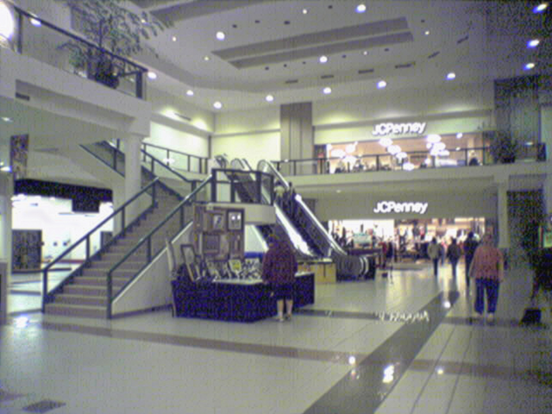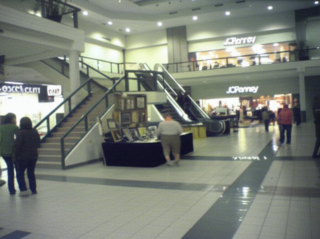 Then there’s ChatGPT, which upscaled it with a lot of detail. We have tiles. We have signage. It made the storefront on the bottom left into an empty storefront. I couldn’t tell you what, if anything, was in it at the time, so I’m giving that a pass for lack of information. However, I will ding it on the JCPenney logo, though, because while it’s mostly correct, the “J” is wrong, being a tad too narrow. Compare to an exterior logo on the Tanglewood store, taken with Big Mavica the year before. I feel like ChatGPT should really know what the Penney’s logo looks like, because it is a very common brand. It also removed a barricade from the left escalator, and replaced it with a small table, and also eliminated the leftmost handrail on that same escalator. As far as people go, it removed two shoppers that are way in the back to the right of the escalator in the control image, and also eliminated a person whose left arm and purse are visible in the edge of the shot. The lady in the pink made it through, as did two shoppers behind her who were walking towards JCPenney, though the guy on the left probably should get that grapefruit-sized growth on his calf looked at. Most interestingly as far as people go, the dude in the shorts and hoodie that was looking at the art display is now a woman. But all in all, it looks like Tanglewood, even if some of the details are off.