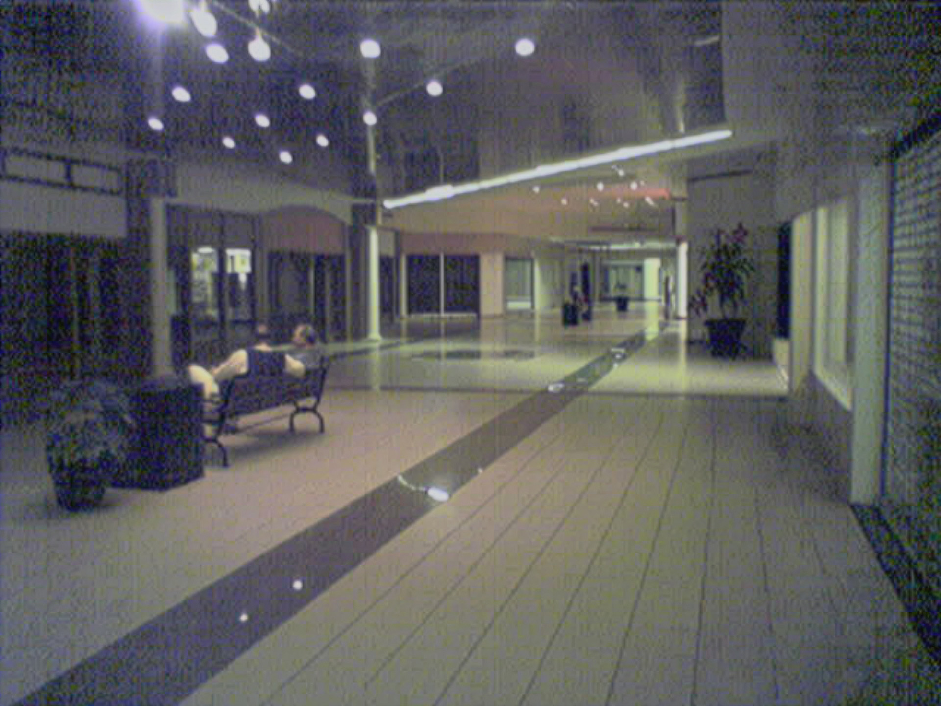 Gemini got a little bit creative with this one. It left the stripes of noise that exist in the original photo, and the tiles are generally defined on both their X and Y axes, but it added a lot more ceiling to the top, putting the back of the corridor in the center, rather than the original positioning, which I feel looks more natural. It also added a second bench and put some random bald guy in it, and neither of those things existed in the original shot. Go figure, I suppose. Still unquestionably potato quality, but with a few liberties taken in the process of its upscaling attempt.
