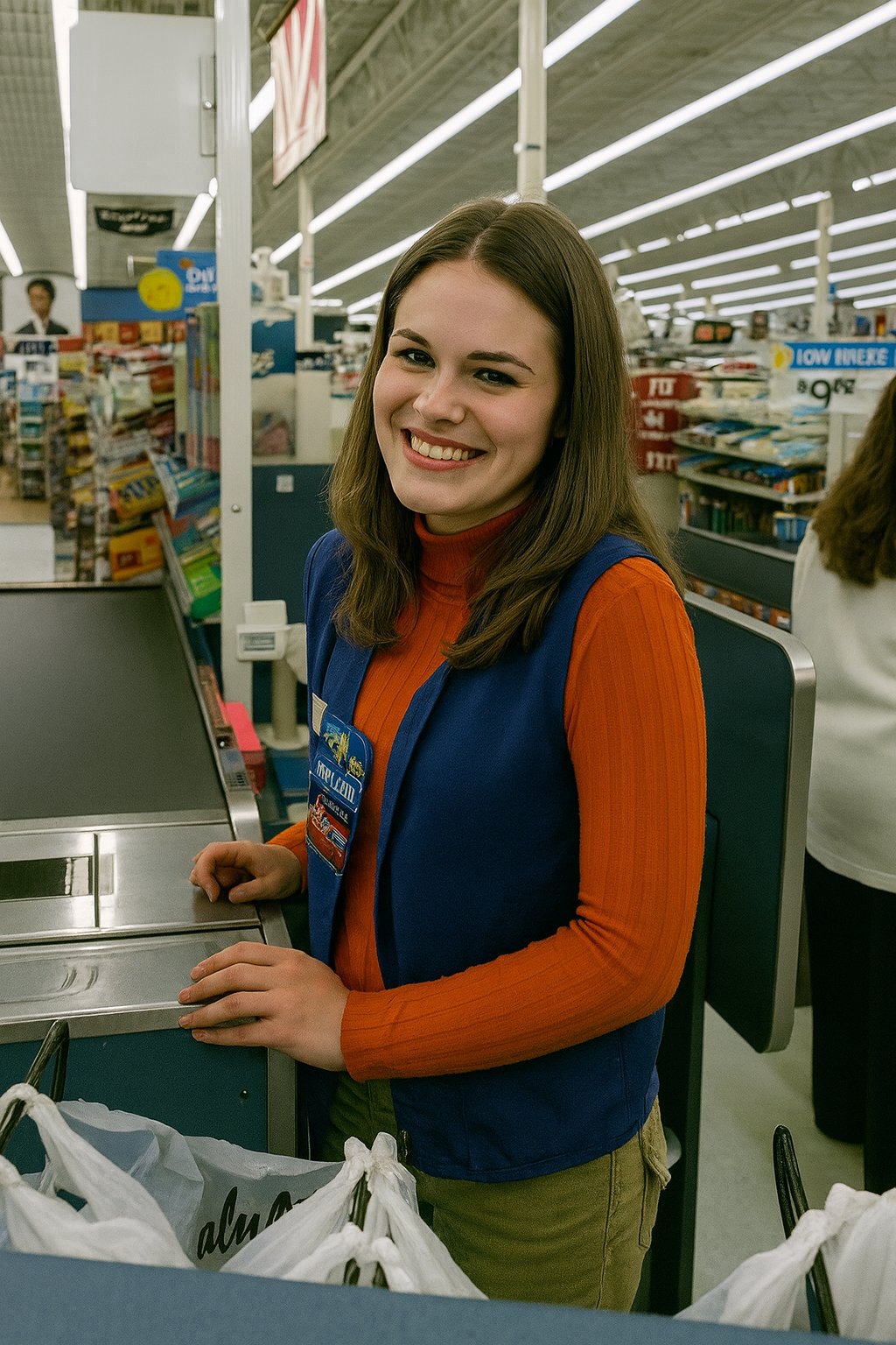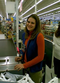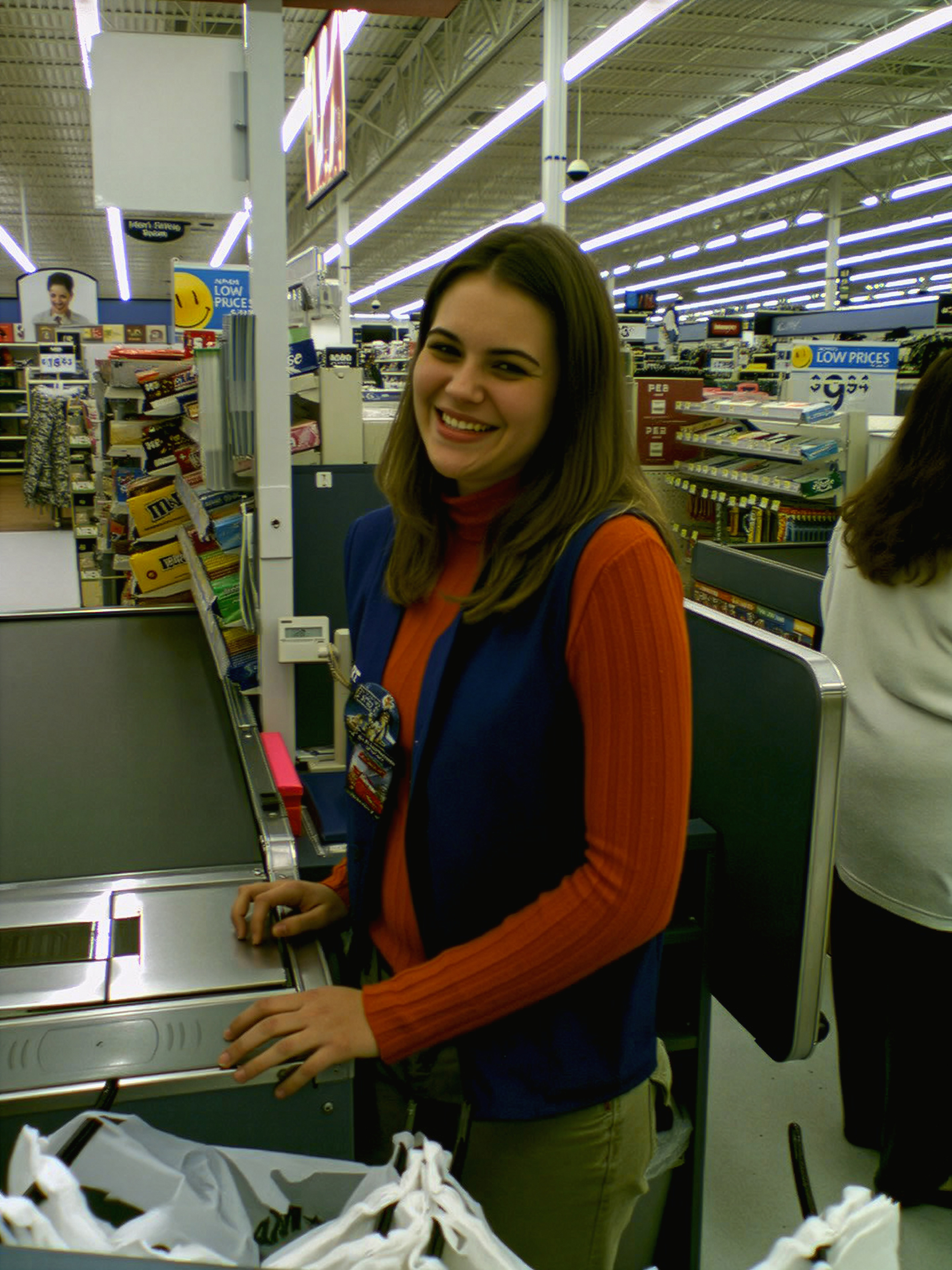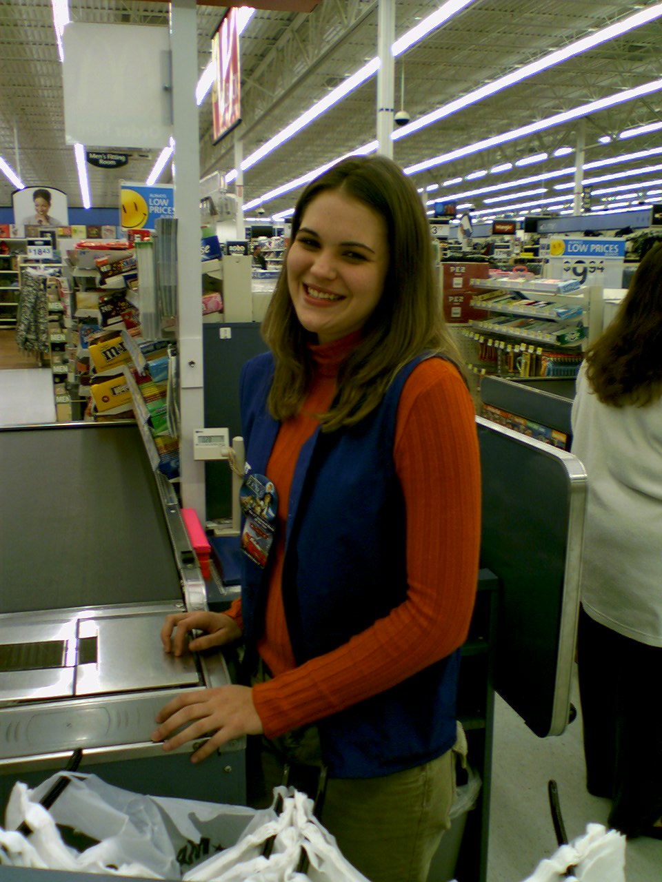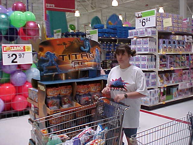 This is a photo of my sister from the original Wal-Mart photo set, which I did on June 9, 2000. This started out as something of a field test for my brand new Sony Mavica digital camera, and then when I got home, I realized that I had enough to do something with the photos, and made a small spread out of them for Schumin Web. I remember that a lot of people online made fun of this set when it was new, but they forget that its purpose was as a field test on a new camera. Looking back on the photo set, it depicts peak nineties Walmart, which is something that was remodeled out of existence long ago.