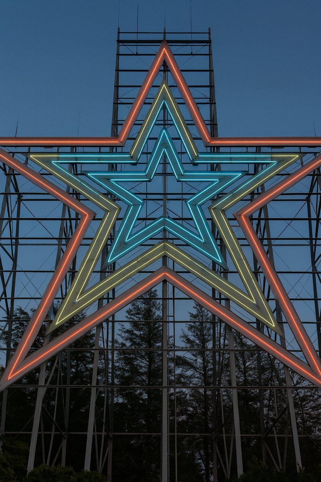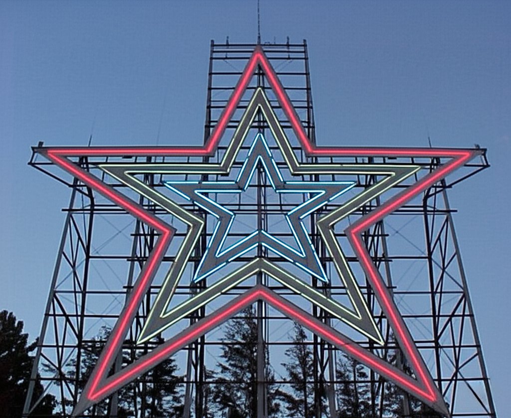 This is the Gemini version of the star photo. Gemini added some space above the star that was not in the original photo, and made the neon sharper than it was. The sky is less grainy than the control, though less so than the Adobe version. However, it did eliminate the breaks in the neon that were in the original photo, making the neon largely continuous, which is not accurate. The end result is still potato quality, though perhaps coming from a slightly better potato.