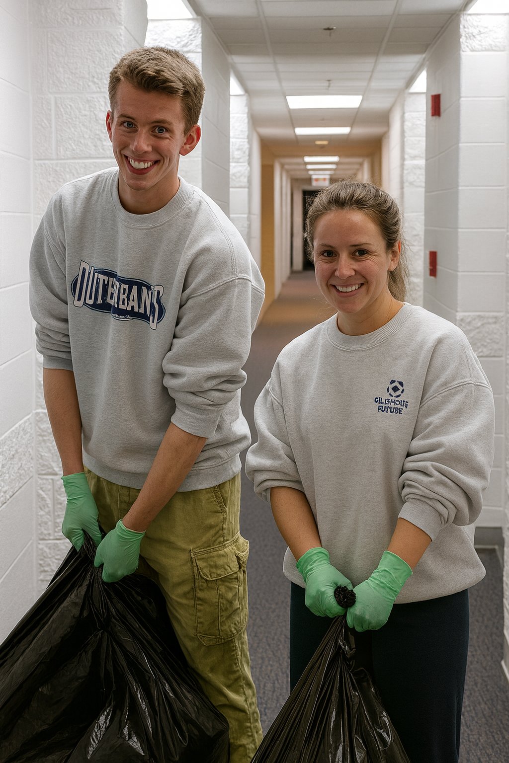 ChatGPT upscaled the image quite well, and fixed my bad lighting. There’s one thing that sticks out to me on this image. Look at their faces: they’ve aged! ChatGPT made them look like they’re in their mid thirties rather than college-aged. Additionally, while Will’s face looks like his own despite the passage of time, that is not Clare’s face. I don’t know whose face that is, but it’s not hers. Looking at other elements of the shot, the printing on Will’s shirt is spot on, while the design on Clare’s shirt, originally depicting a soccer ball and some text, with “SOCCER” as the second line, now reads, “GILISHOUS FUTUBE” (okay, then!). It also removed a curved glass-block wall that is behind Clare in the original photo, replacing it with a straight wall.