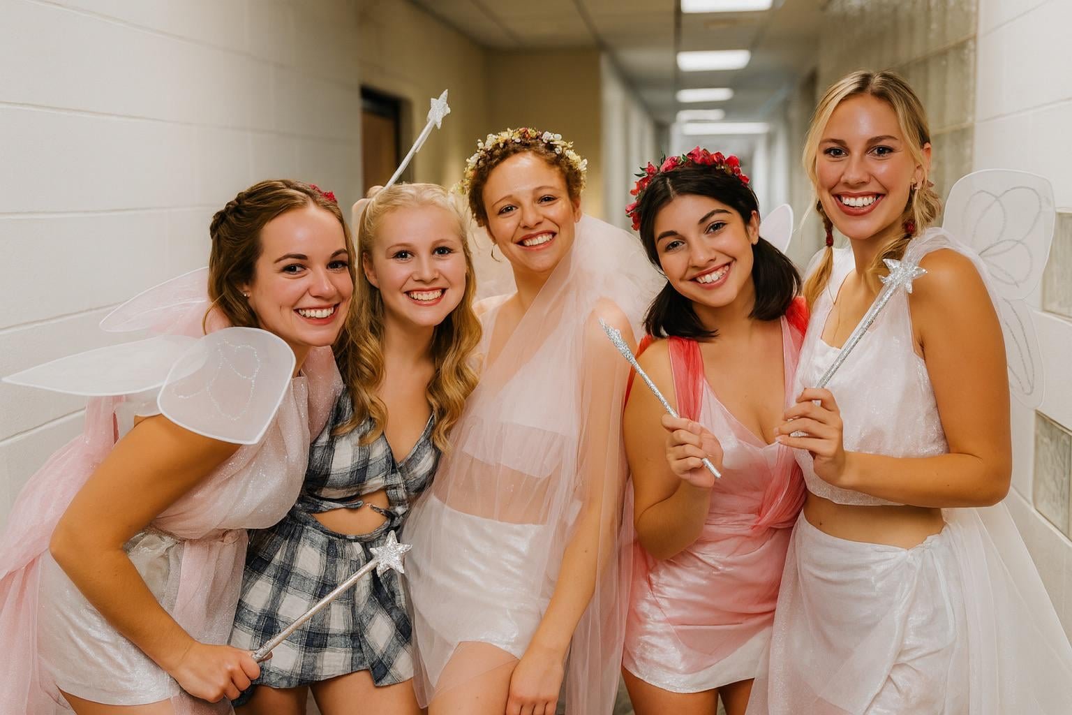 ChatGPT, meanwhile, made a sharp looking image, but sacrificed their faces. Girls 1, 2, and 4 look more or less like the control photo, but girls 3 and 5 do not. Additionally, girl 2’s outfit was changed significantly, going from silver fabric to a plaid print, which lends itself more to “slutty Catholic school girl” than “fairy”. It also flattened out that signature Potomac Hall curved glass-block wall, and added additional glass blocks to the hallway. So while it certainly took some liberties with the subjects, it still ultimately captured the essence of the shot, even if it substituted a few of them for someone else.