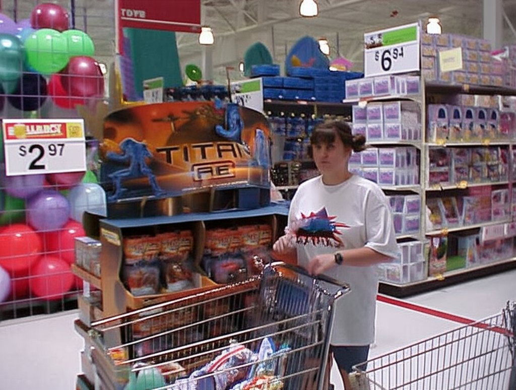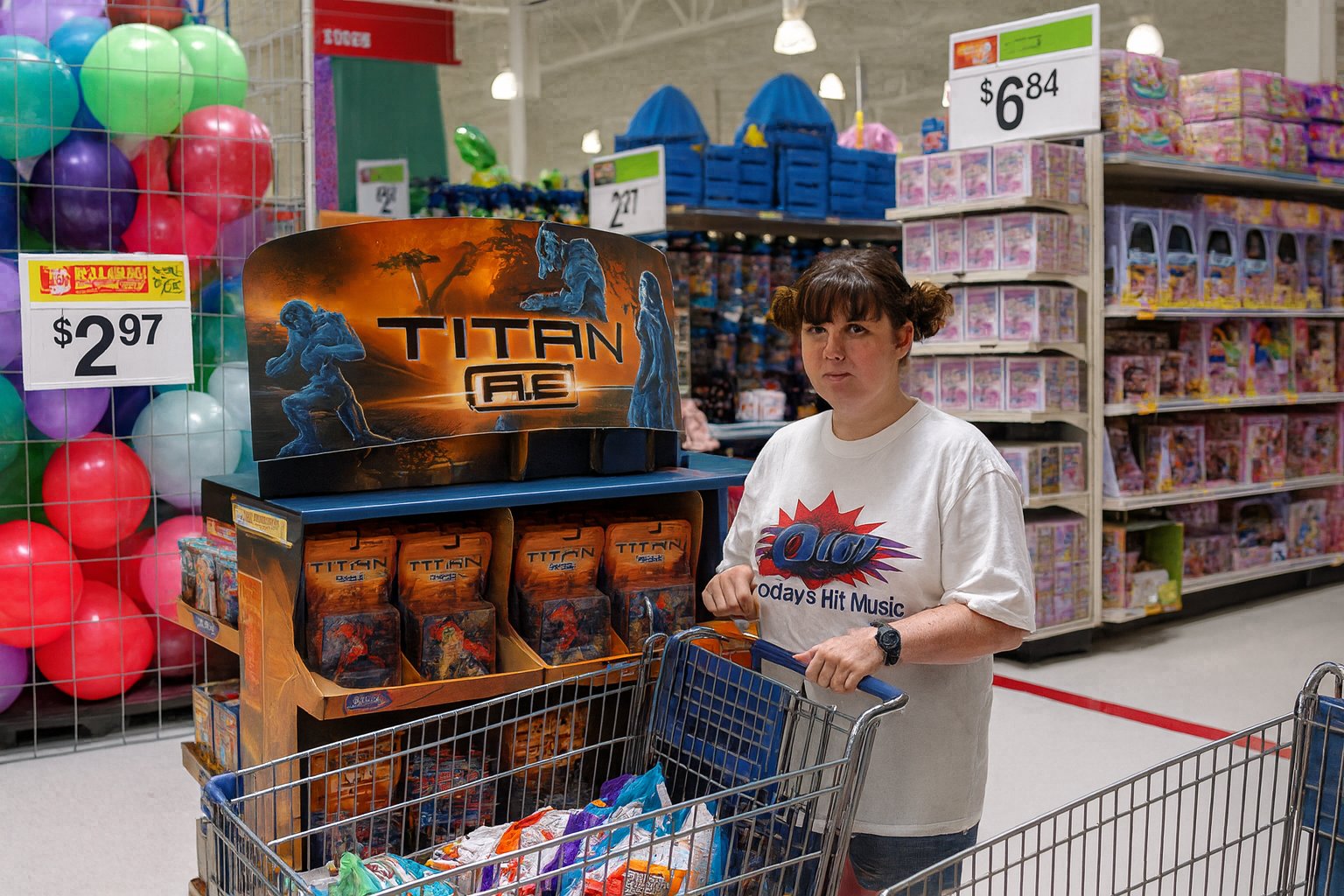 Gemini’s upscaling of the photo was still potato quality, but it also mangled up the text. Note the red sign at the top that says “TOYS” on it, and the “ROLLBACK” sign over the $2.97 price sign. Those are highly distorted, despite being legible in the control image. Also, that is not my sister’s face, now looking slightly towards the camera. I don’t know who that is that’s wearing my sister’s clothing, but it’s not her. It also smeared the logo on her shirt, which is supposed to be the logo for WQPO, a radio station licensed to Harrisburg, Virginia that brands itself as “Q101”.