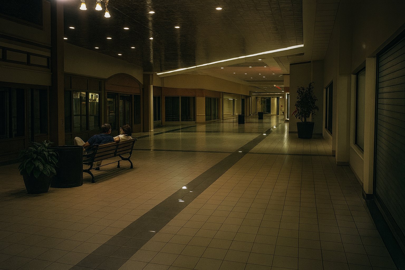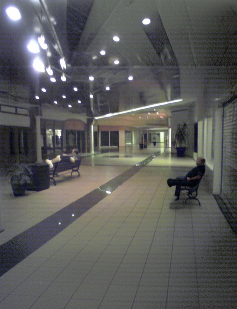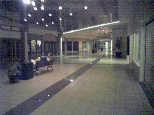I took this photo on the same day as the other one, showing a single-story corridor that extends southwest from the end of the main portion of the mall. I published it as part of the Random Encounters photo set. Unlike the rest of the mall, this section had low lighting and a silvery, highly reflective ceiling that consisted of narrow slats. When I was familiar with it, the wing was largely dead, with no tenants except for maybe a police substation somewhere in the back. The corridor was eliminated a few years later in favor of a new, larger Stein Mart store, so it’s possible that the deadness of this wing was because the mall was running out leases in this section ahead of the reconfiguration of that part of the building. Relative to the rest of the mall, if you look at this panoramic image of the mall from 2014, Stein Mart’s mall entrance is in the same spot as this corridor was. My photo is the only one that I have ever seen of this part of the mall, and no one else on the Internet has seen anything else, either. So I suppose that despite its very potato-like quality, it does have some historic value to it.