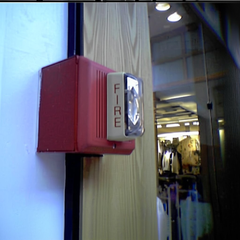 Gemini decided to crop this one differently, placing the fire alarm somewhat off-center, and added more window on the right side of the image, and more wall on the bottom. There is also an awkward black bar at the top. The lettering isn’t quite as detailed as on the control, and the yellow shirt in the background lacks some detail that the control image has. I don’t necessarily mind the off-center placement, though, because I will sometimes do that in my more recent alarm photos to create an alarm-watching-its-surroundings look of sorts (example).