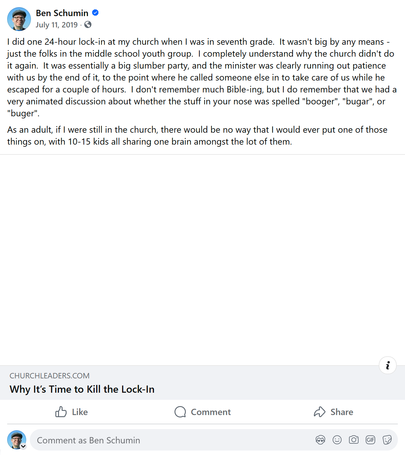 I got the sense that the minister had bitten off a bit more than he was willing to chew in planning this one.  We had fun and didn’t do anything that would get anyone into trouble, but a bunch of kids between 11 and 13 years old and only one adult was a lot to deal with.  The activities were less about religion and more about keeping the group entertained, but it was fun all the same.  I got the sense that the minister started this lock-in with the best of intentions, but I got the sense that his patience wasn’t as long as the lock-in was scheduled to run, and I sensed that he was getting somewhat irritable in the back half of the lock-in.  For about four hours towards the end of the event, we had another congregant, who had something of an unofficial leadership role in the church, watching over us and helping to keep us entertained during the final stretch while the minister attended to some matters offsite.  I don’t know what the matters were, but I suspect that he just needed a break from us for a while.  When he returned later, he was in a much better mood, which told me that a respite from us was probably exactly what he needed.  And I don’t blame him, because we were all fired up and full of sugar.  We never had another lock-in while I was involved in youth group, and I don’t blame anyone for not wanting to it again, because while it was fun, a good time was had by all of us kids, and no scandals emerged from it, it was basically a giant slumber party more than anything else.  We had plenty of all-day activities in later years, but never another lock-in or other overnight activity, which is fair enough.  In other words, I completely sympathize with the writer of the article that I linked on the second Facebook post about why youth lock-ins are for the birds.  I sure as hell wouldn’t voluntarily put myself in that situation, tasked with being the only adult supervising a bunch of overcaffeinated middle schoolers running around a church building for 24 hours.