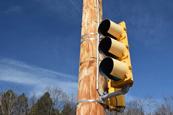 Traffic signal mounted to a utility pole at the intersection of Main Street, Manchester Street, Hanover Street, and Baltimore Street in Glen Rock, Pennsylvania.