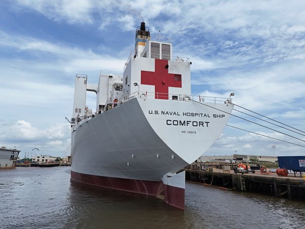 The USNS Comfort, a Mercy-class hospital ship, docked in Mobile, Alabama.